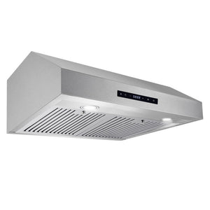 Upgrade your kitchen with the sleek and professional Cosmo UMC30 range hood in brushed stainless steel. Its touchscreen and backlit display give you easy control over fan speed, LED lights, and a convenient timer. With an efficient 380 CFM airflow and durable, dishwasher-safe stainless steel filters, cleaning up is a breeze. Plus, the UMC30 comes with a 120V 3 prong power cord for hassle-free installation. Experience professional luxury at factory direct prices with Cosmo Appliances.