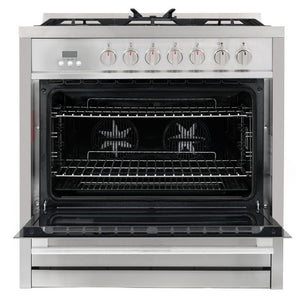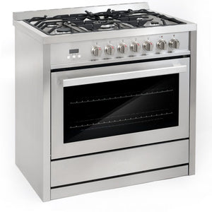 Cook for the whole family with less time and effort. Cosmo’s F965 36 in. Freestanding Single Oven Dual Fuel Range features a 5 sealed gas burner cooktop and a spacious 3.8 cu. ft. electric oven capacity. The sealed gas burners range from 5,000 BTU for precise heat and simmering delicate sauces to a powerful 18,000 BTU triple ring burner to provide high heat for cooking meat and boiling water. The 3.8 cu. ft. True European Convection electric oven has 8 functions, including defrost, pizza, and convection bake modes, to deliver perfectly cooked meals every time. Our gas range features overheating protection and a cool-to-touch oven door handle so you can cook with peace of mind. Thanks to the removable backsplash, this 36 in. dual fuel range can be used for either freestanding or slide-in installations. Trust Cosmo to deliver professional quality and design at factory direct prices.