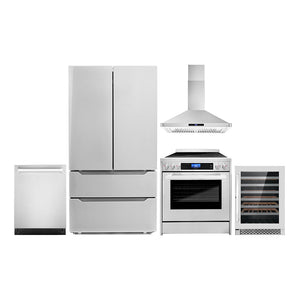 Cosmo Package - 30" Electric Range, Wall Mount Range Hood, Dishwasher, Refrigerator with Ice Maker and Wine Cooler, COS-5PKG-021