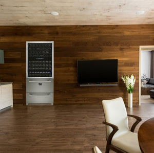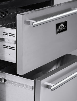 The Capraia Beverage Center by Forno features a upper wine cooler that can hold up to 144 bottles and 2 lower drawers that can hold up to 200 cans. The unit also features 8 wine racks, blue LED interior lights and electronic control.