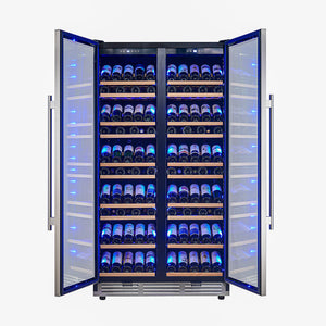 The FORNO 40" dual zone wine cooler has a 25.07 cu.ft. capacity, holding up to 166 bottles. It features a stainless steel door, triple-layer anti-UV glass, and a charcoal air filter to protect your collection. The elegant design includes wooden sliding shelves, a display shelf, and blue LED lighting. Use the touch screen panel to precisely control the temperature. The high-efficiency compressor consumes only 305 kWh per year. The lockable door adds security and style to any space.