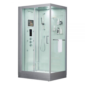 This beautiful steam enclosure design will be the feature of any bathroom, with sleek white or black glass rear paneling and a transparent glass front. This model includes a built-in Smart TV, Bluetooth control panel, overhead spotlighting, rainfall shower, six recessed body jets, seating, shelves, and thermostatic water control, in addition to all of the health benefits associated with steam sessions. The Lucca steam shower has a small footprint, making it suitable for most bathrooms.